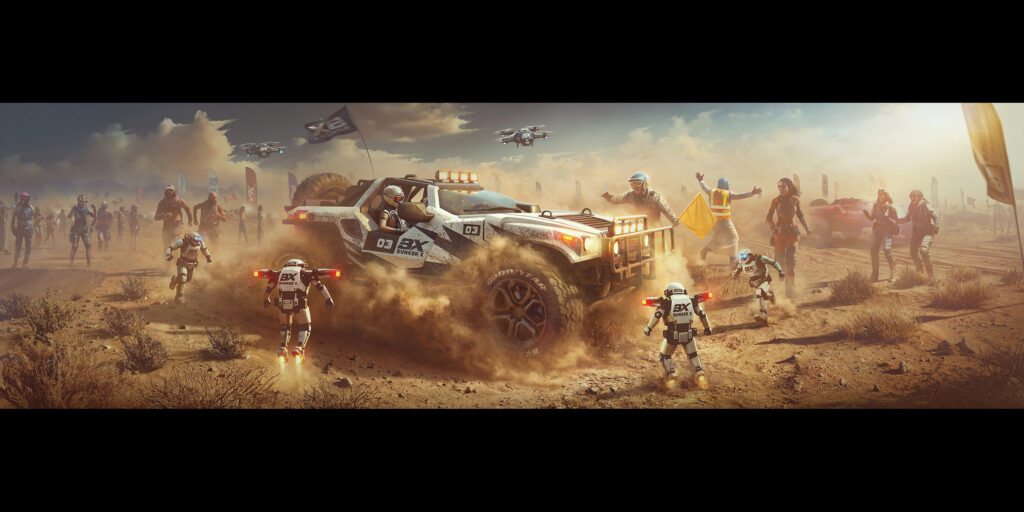 A shared racing world designed for location based experiences and at home play, where racers, crews, and spectators compete together across simulators, screens, and real scale desert environments.