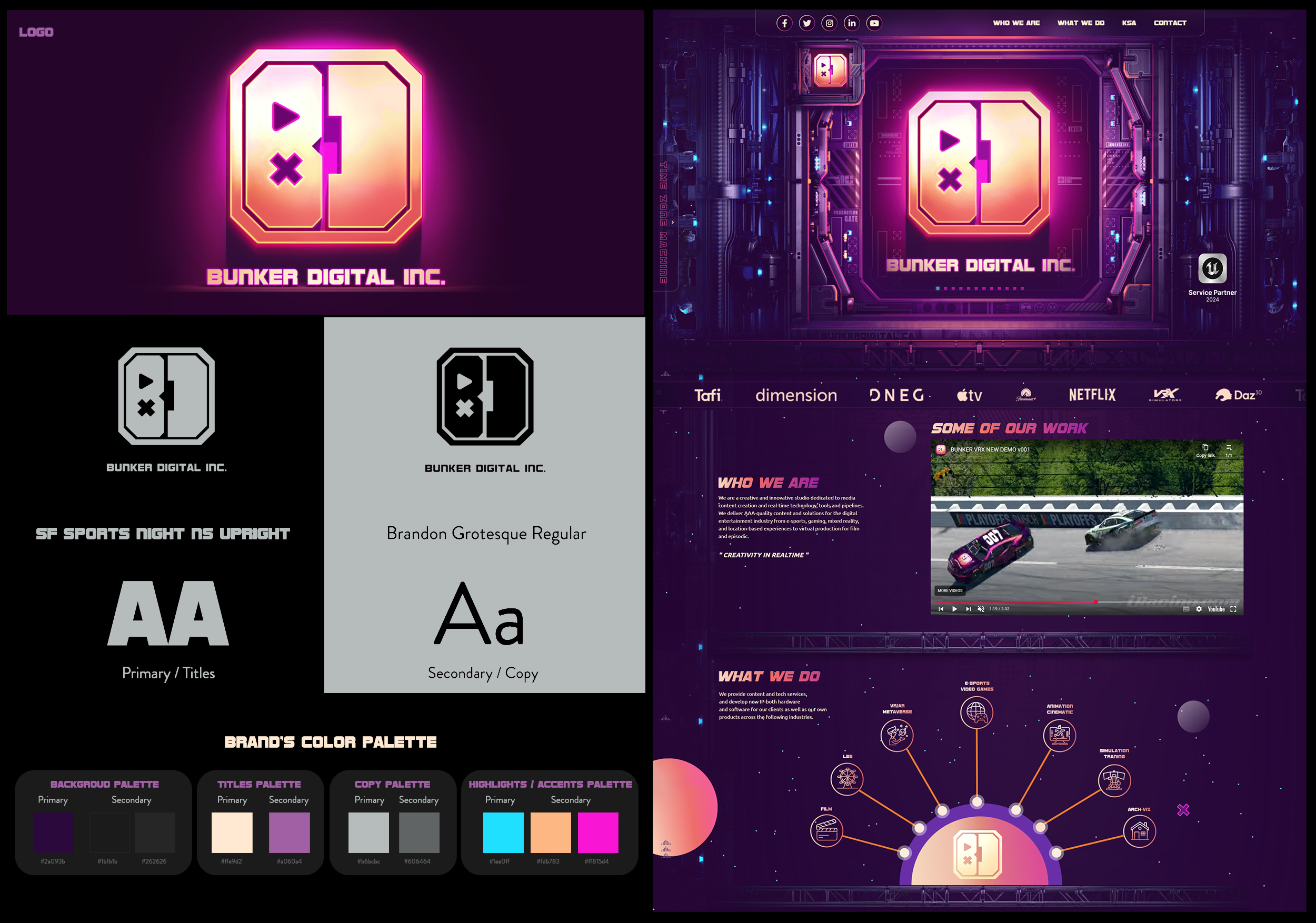 From the beginning, I wanted a brand identity that reflected both our line of work and the premium, polished, three dimensional aesthetic at the core of our studio. That vision led to the creation of the BDI Gate, a custom 3D emblem I designed and built in Maya and Photoshop. It became the foundation for our visual language and the look and feel of the Bunker Digital brand.