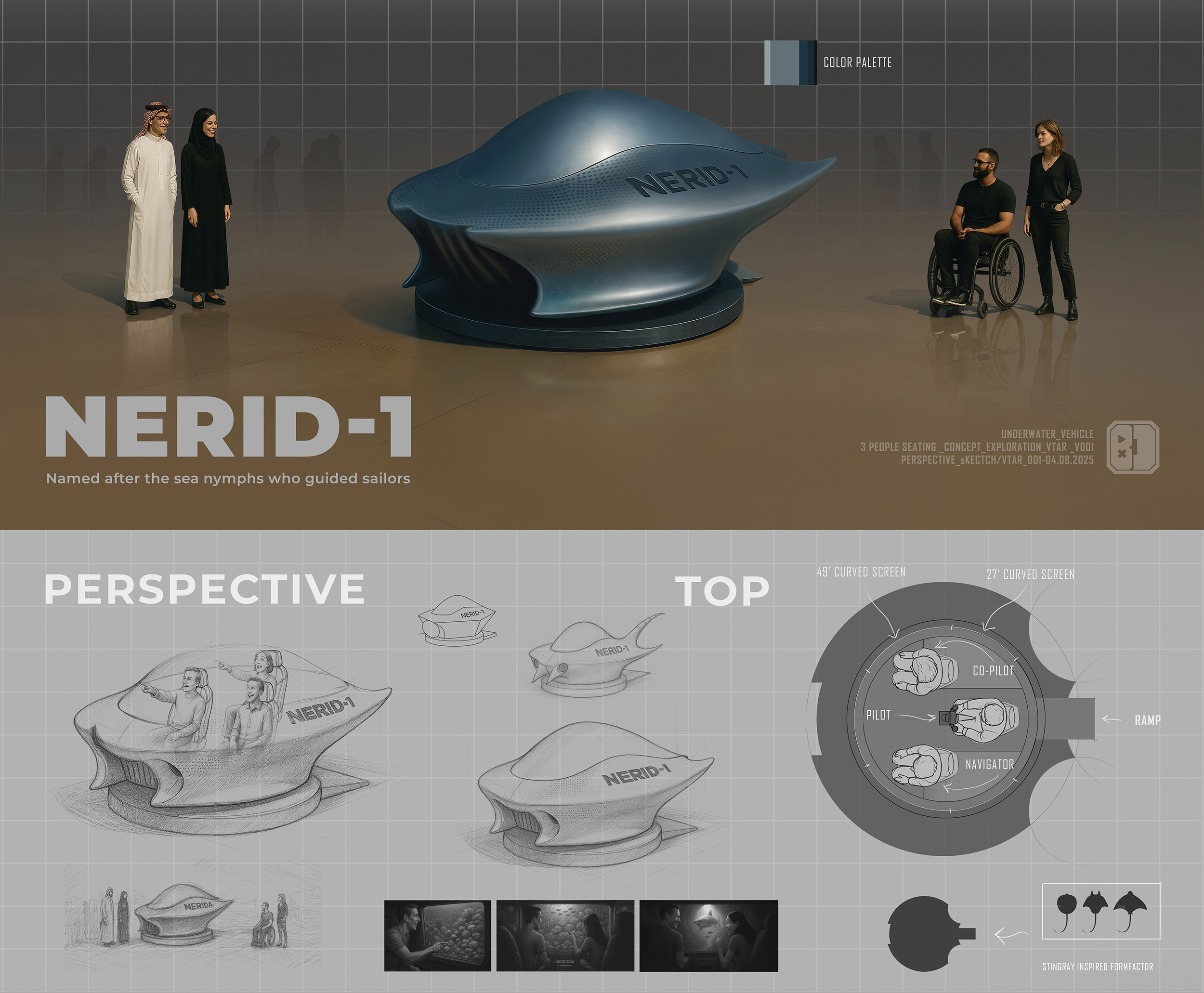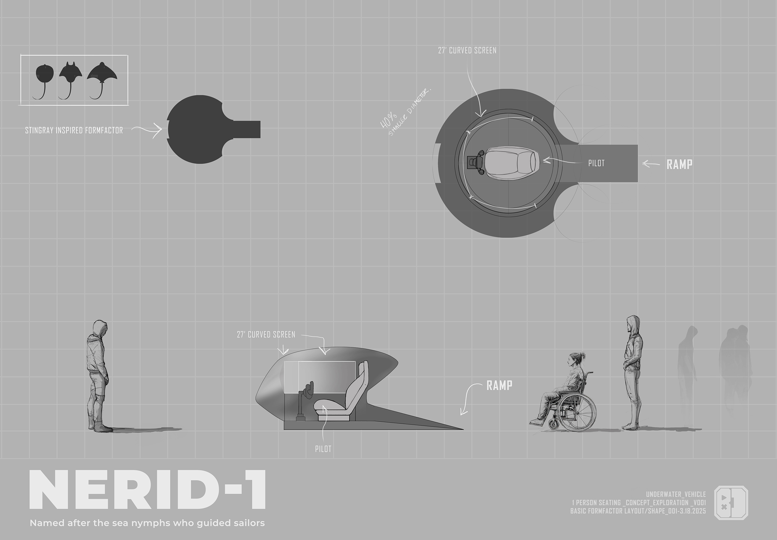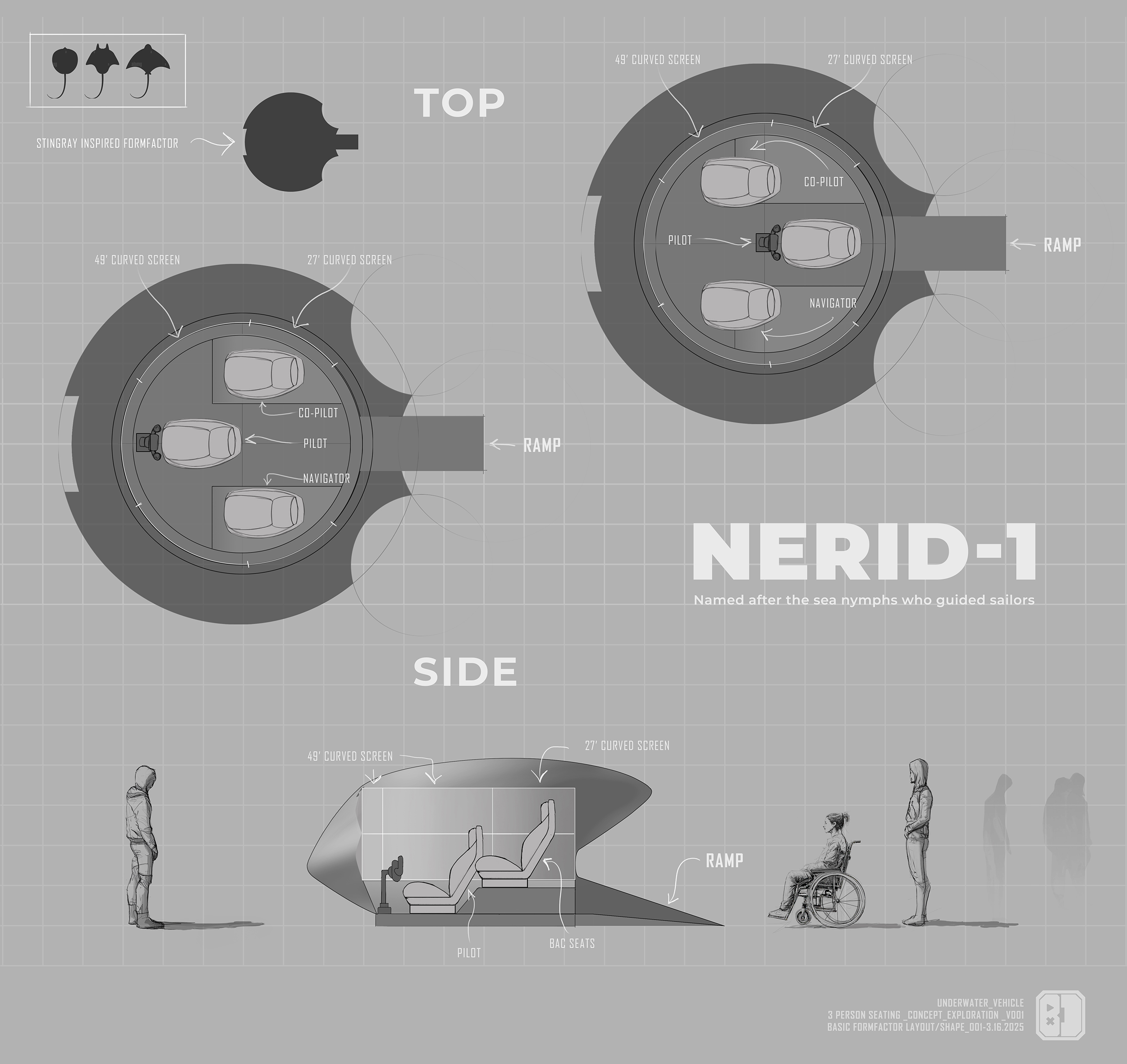 NERID-1 is a next-generation mixed reality motion system I designed specifically for immersive exploration of a Reef Digital Twin. Inspired by underwater vehicles, its sculpted outer form pays homage to marine travel and mythology—named after the sea nymphs who guided ancient sailors. Inside, I designed the cockpit-like interior to feel like a real submersible, replacing physical windows with curved panoramic screens that display real-time, photorealistic underwater environments built in Unreal Engine.