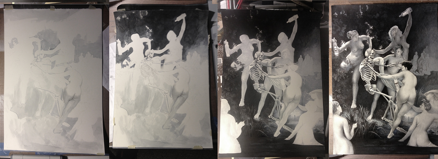 At the center stands a skeleton pulled into the dance, a reminder that death joins every celebration and that time is always present even in our most reckless moments. The figures raise bottles, grasp at pleasure, and chase distraction, all while the background fades into shadow and silence. What seems alive and wild is touched by decay. What seems joyful carries an undercurrent of consequence.