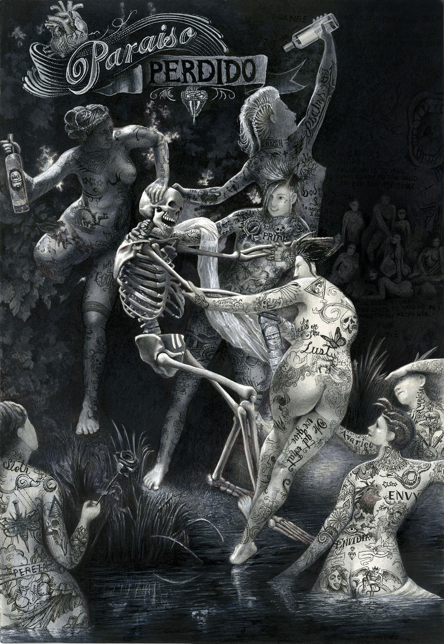 The title Paraiso Perdido speaks to a paradise that is lost not by accident but by choice. It is a reflection on how people surrender themselves to temptation and excess while believing they are free. The tattoos symbolize the stories, wounds, and desires that shape us. The skeleton represents the truth we try to avoid. And the overall composition is a reminder that paradise is fragile when we confuse indulgence with freedom.