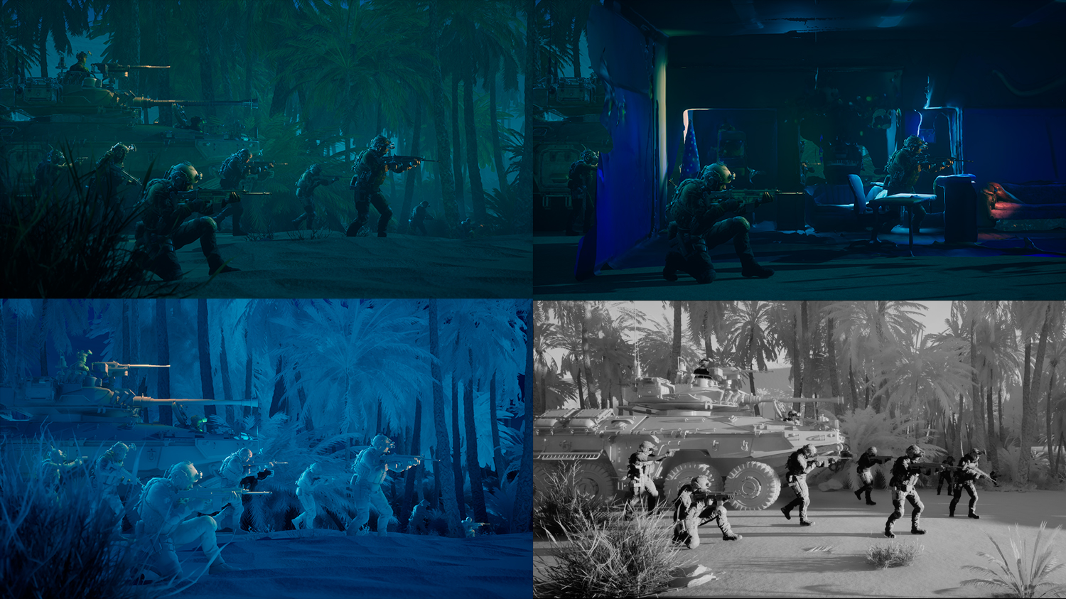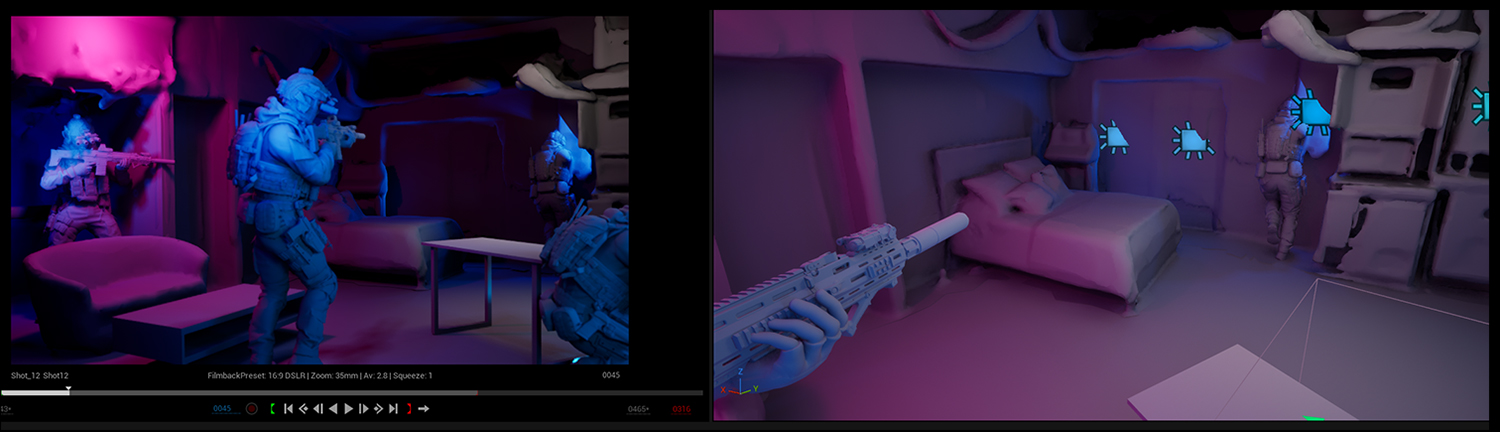 We used Unreal Engine, Maya, After Effects, as well as photogrammetry of several locations and greenscreen elements to integrate in-game, cinematic, and sound-driven action shots.